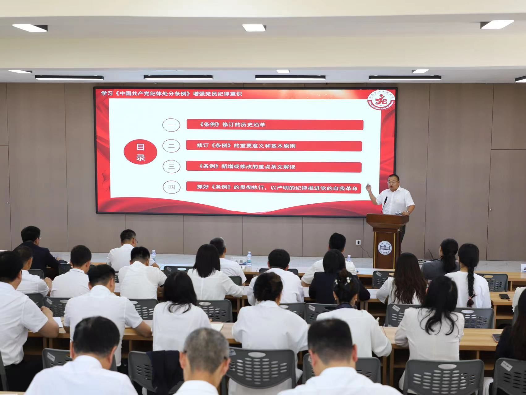 本次《学习<中国共产党纪律处分条例>增强党员纪律意识》党纪学习教育专题党课,范晓虎老师从《条例》修订的历史沿革、修订《条例》的重要意义和基本原则、《条例》新增或修改的重点条文解读和抓好《条例》的贯彻执行,以严明的纪律推进党的自我革命等四个方面做了深刻、精彩、生动的讲授,本次党纪学习教育专题党课,既有理论高度,又紧密联系实际,既是一次生动的理论辅导,又是一次深入的思想动员。