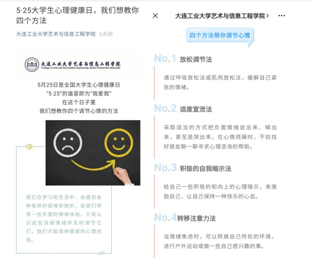 学校通过微信平台宣传心理健康知识,引导学生认识自己的消极情绪,掌握调节负面情绪的方法,提高学生自我调节的能力,培养学生形成积极乐观的人生态度。
