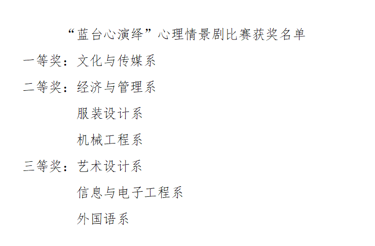 心理情景剧活动得到了学生热情的支持和积极的参与。各系组织创作和排练,评选出优秀作品参加校赛。参赛作品诠释了情绪问题、人际问题和成长问题等心理健康问题,学生在参与心理情景剧活动的过程中,了解心理健康知识,更加深刻的认识自我,实现自我成长。