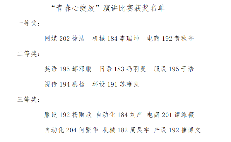 学生围绕“青春心绽放”主题,讲述自己青春成长中的经历和梦想,内容充实,生动感人,具有激励性。本次演讲比赛活动为学生提供了一个锻炼自己、展示自己的机会。