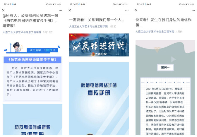 利用学校官方微信公众号转发《防范电信网络诈骗宣传手册》(电子版),发布防范电信网络诈骗犯罪相关信息,开展反骗防骗宣传,提高广大师生反骗防骗能力。