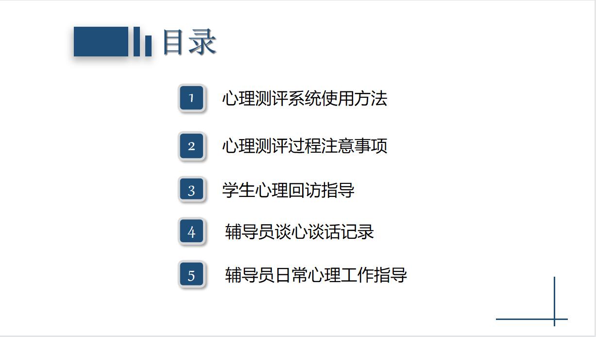 本次培训由学校心理咨询中心江潇老师主讲,内容包括心理测评系统的使用方法、测评过程注意事项、学生心理回访指导、辅导员谈心谈话和辅导员心理健康教育工作指导。在培训会上,江潇老师详细介绍了学生心理测评过程中对测评时间、测评环境等注意事项,重点介绍了学生常见的几种心理危机和需要重点关注的高危学生群体,并结合案例,对辅导员心理健康教育工作方法进行指导。