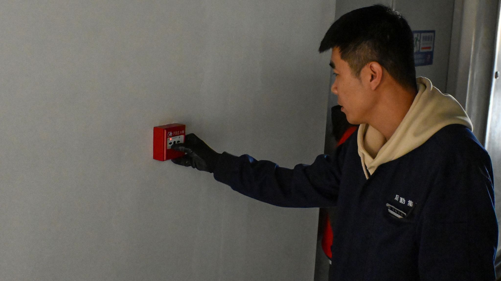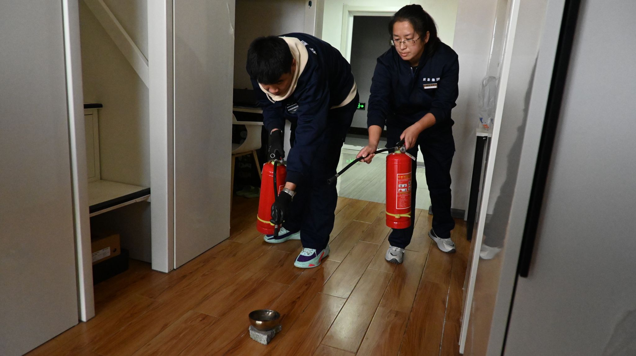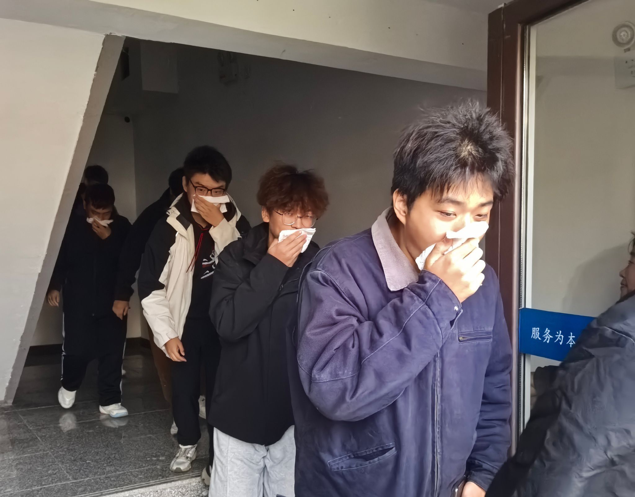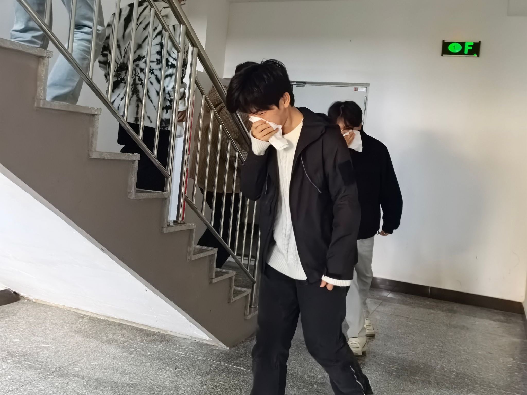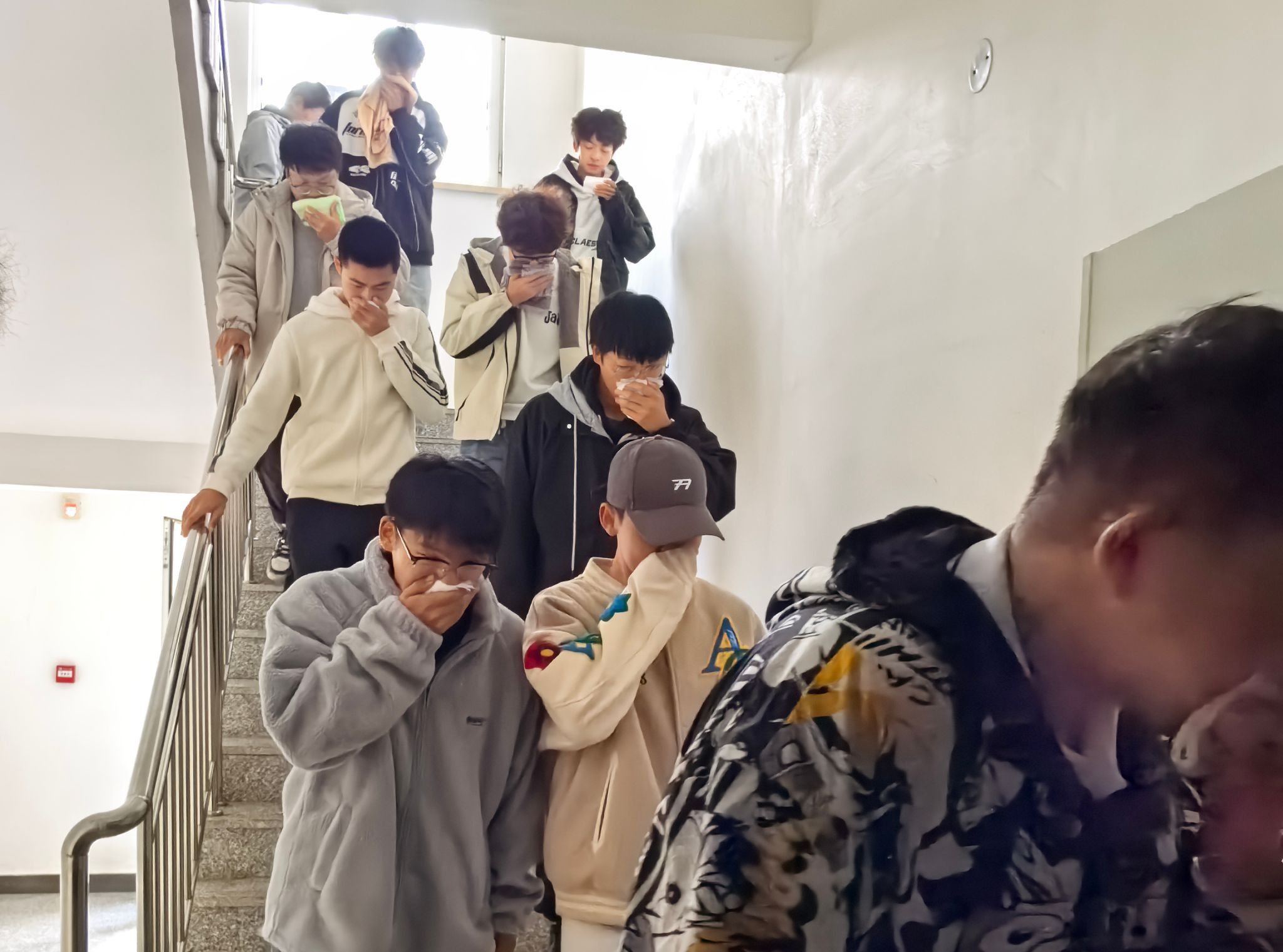 随着消防警报声响起,全体人员立刻进入紧急避险状态。楼长、层长第一时间到达指定岗位,引导学生迅速疏散。同学们用湿毛巾捂住口鼻,弯腰低头,沿着疏散线路有序撤离至指定安全区域,仅用时4分52秒,各楼层负责人清点人数后,将撤离情况汇报至楼长,最终楼长向总指挥汇报。