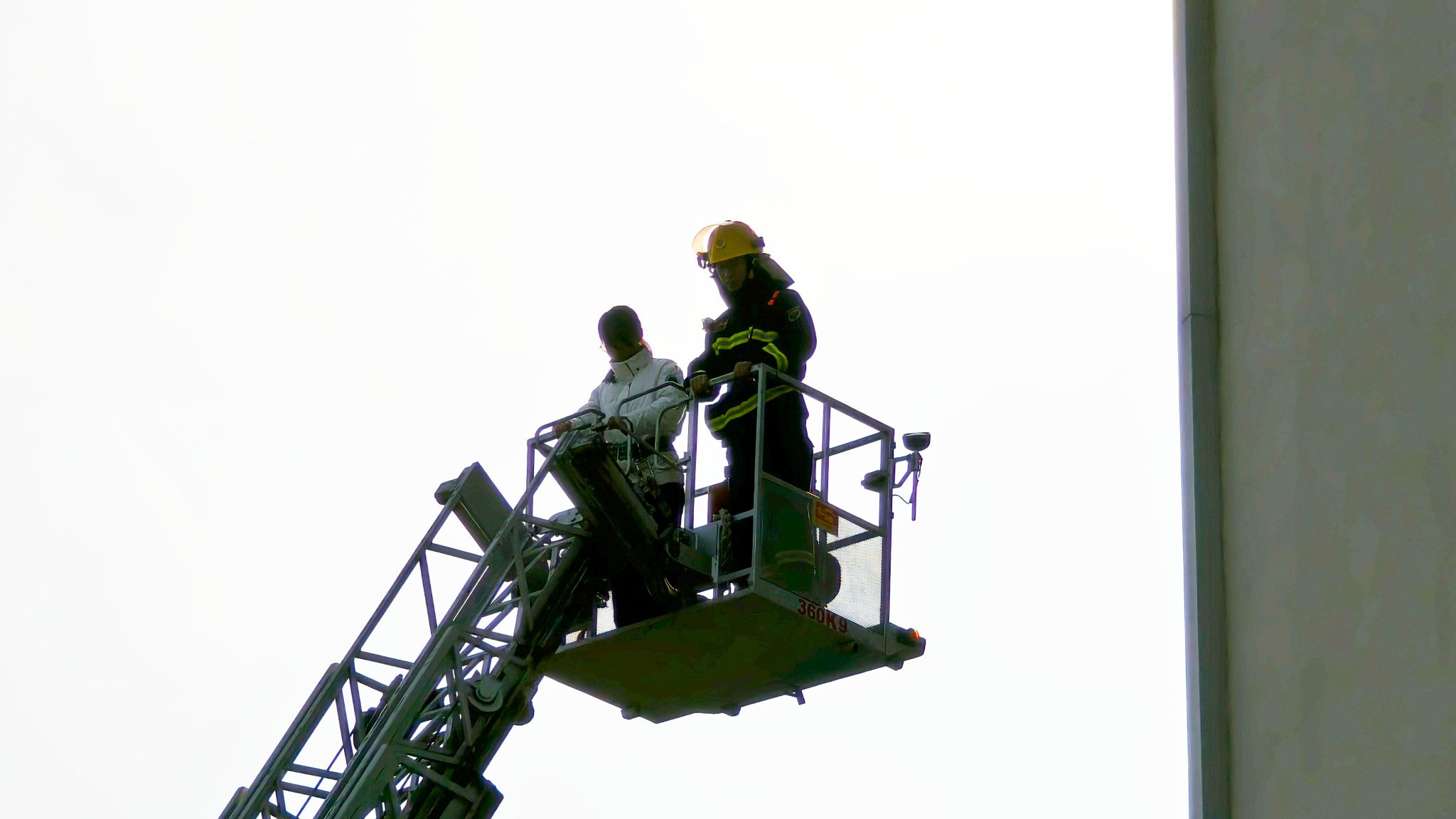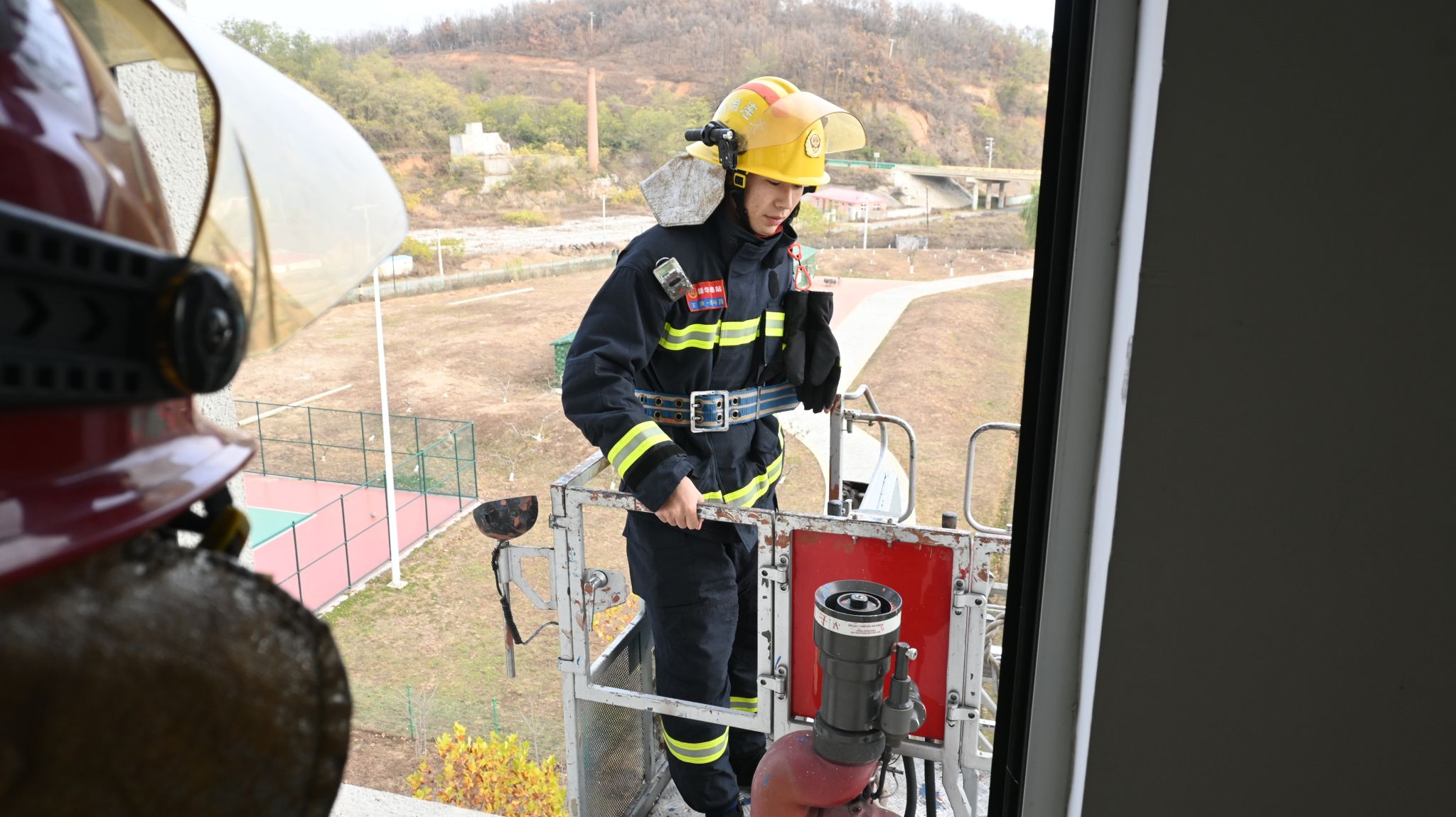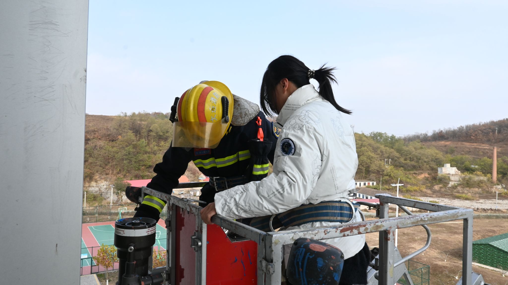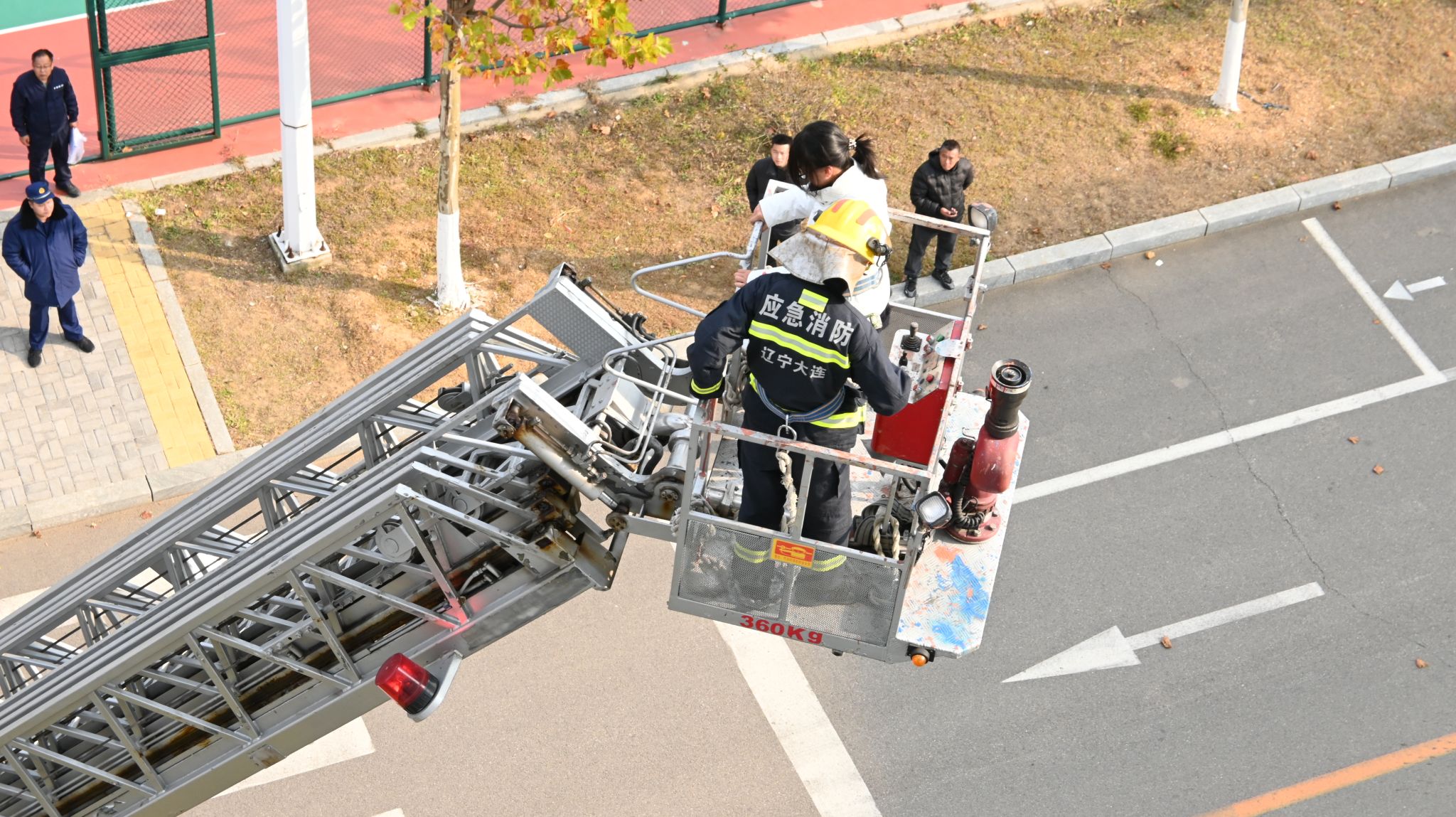 总指挥汇报人员疏散、火情实况、被困人员等情况,消防员们迅速评估火势和现场情况,制定救援计划,深入火场内部展开灭火及救援行动,搜救被困人员,并通过云梯将受困学生顺利救出。整个演练过程严肃认真、井然有序。