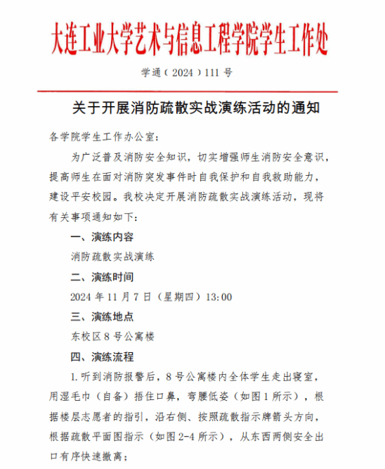 学生处统筹部署,学生处印发《关于开展消防疏散实战演练活动的通知》(学通(2024)111号),细化了本次演练的疏散流程、路线,明确了各单位、部门工作任务及楼长、层长职责,为本次活动的安全有序开展提供坚实的保障。