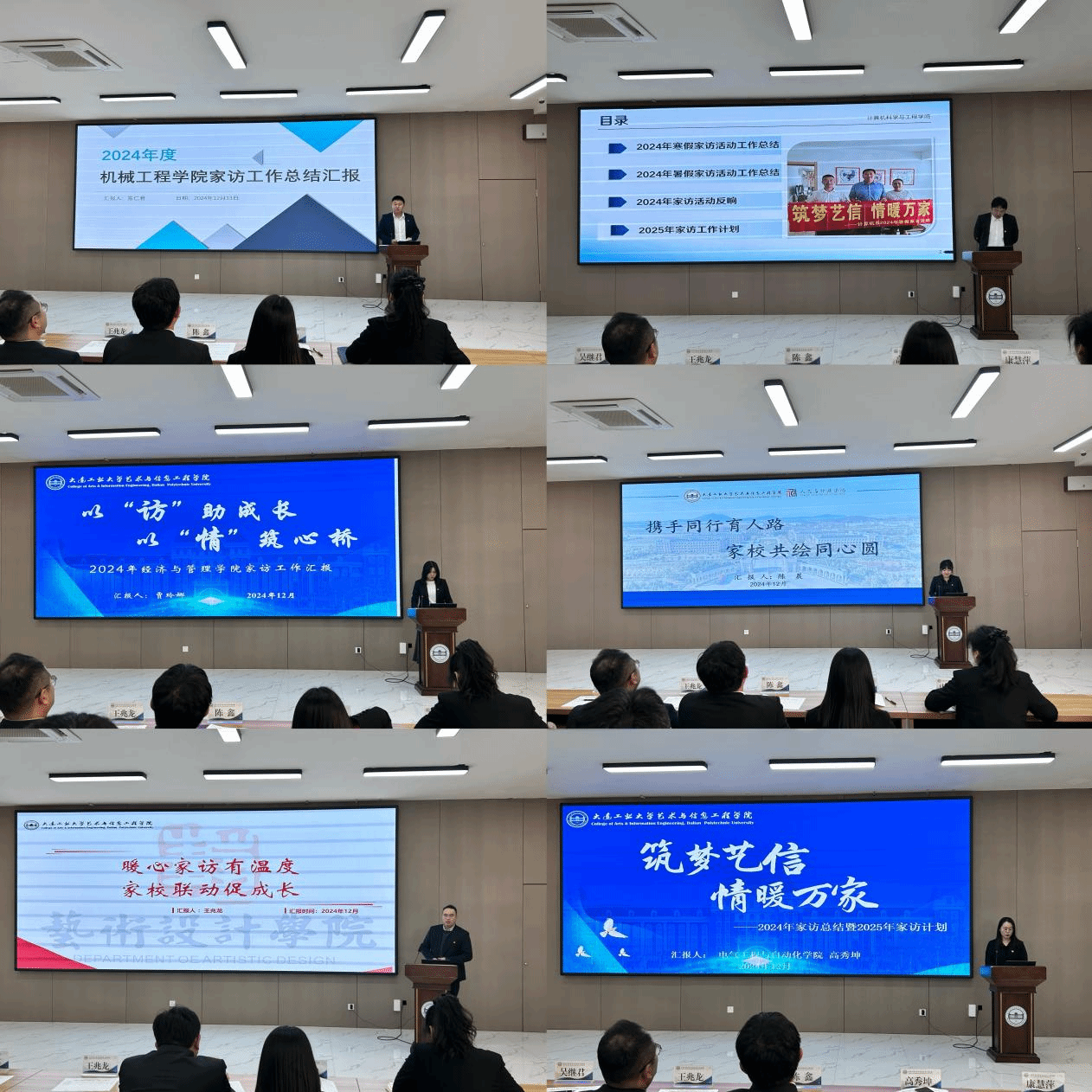 会上,各学院学生工作副院长(分团委书记)以 PPT 形式进行汇报展示,对2024 年度家访工作开展情况进行了全面总结汇报,并就 2025 年家访工作计划做简要介绍。2024年度,beat365家访团共计线下家访220户,线上家访1280余人,足迹遍布辽宁省内14个地市,范围覆盖全国20个招生省份;举行地区家长会10余场,开展爱国主义教育活动10余次,走访实习实践基地8个,走访企业8个,回访优秀校友40余人,将“N+融合式”家访落到实处,取得了显著成效。