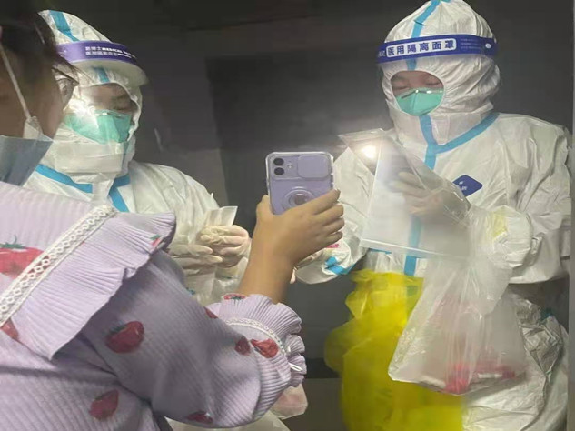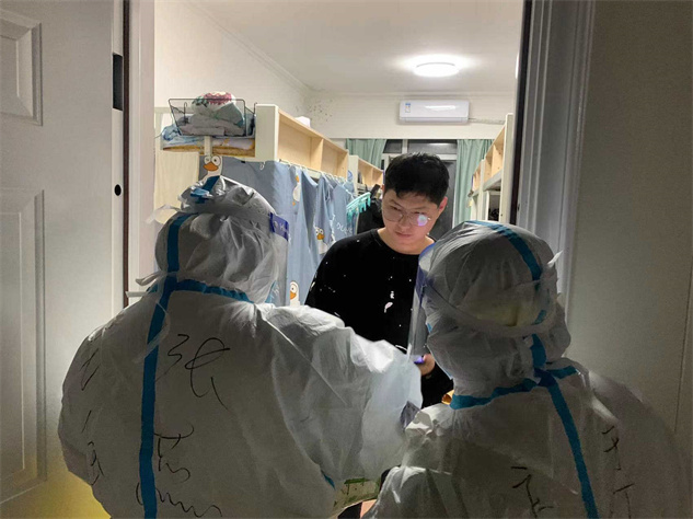 采样过程中,同学们依次出示行程码,足不出户进行核酸检测。