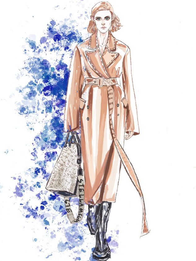 作品介绍:根据老师给出的题目和要求,我选择长款风衣和以及能体现出温暖和高级感的驼色来诠释主题。主要使用Procreate进行绘制。根据表达效果,在多方尝试后,选择画笔库中的粉笔刷进行线稿勾勒和效果图上色,并使用喷溅的方式制作背景,衬托氛围。