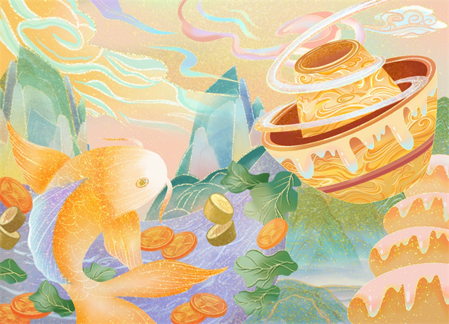 作品介绍:画面构思取自于“鱼跃鸢飞”一词,即世间生物自得其乐。画面选取了火锅、蔬菜、鱼、汤圆等食材元素和山、云、水等风景元素进行创意组合,寓意年丰时稔、国家安康、太平盛世。