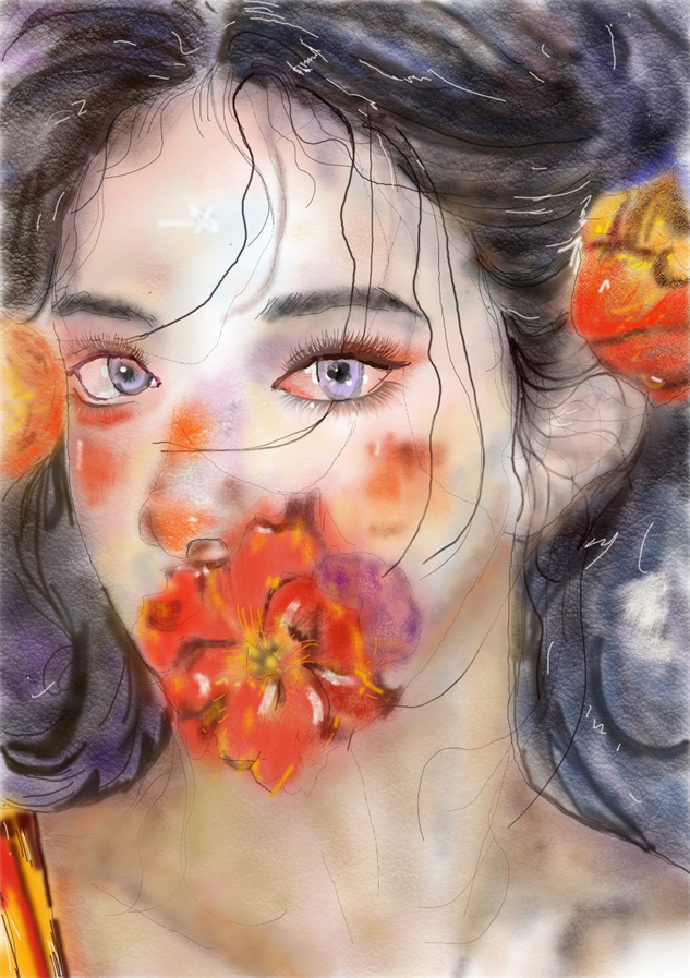 教师评语:人物神情的刻画细腻传神,头发及服饰的绘制细节丰富且有肌理感。色彩搭配和谐,且有冷暖色和面积的对比与穿插。