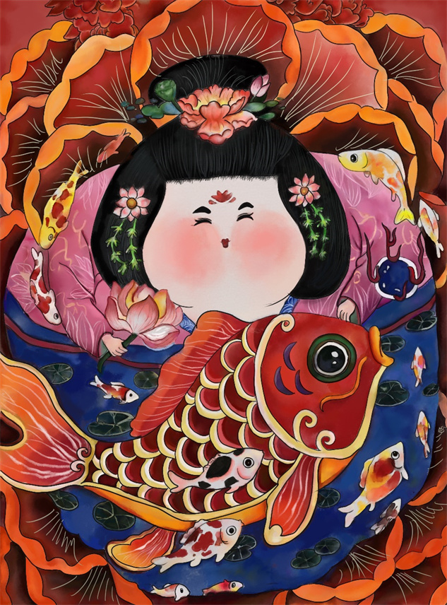教师评语:学生有选择的提取出民间文化中喜闻乐见的娃娃、荷花、鲤鱼等元素,并从当代审美视角出发对其进行重塑和组合,整体构图饱满,画面中心和细节肌理等经营到位。大量红色系的运用,展示出创作者积极乐观的人生态度。