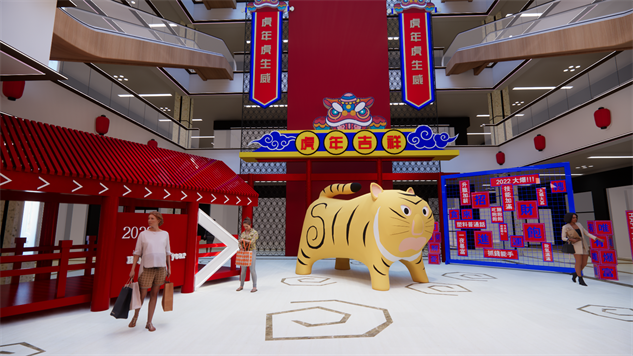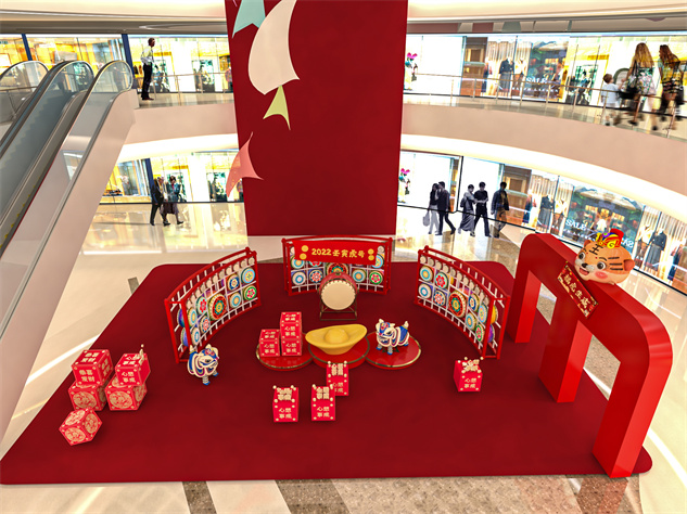 作品介绍:2022年元旦即将来临,喜庆的红色布景,虎虎生威的专属虎年雕像、富有中国特色的节日条幅、新年贺词充斥在中庭为商场营造浓浓中国年气氛。在传统基础上,为了更能吸引年轻人驻足还特意融入了国潮元素,例如,祥云等。