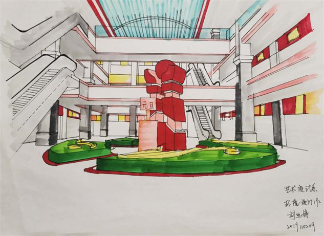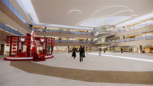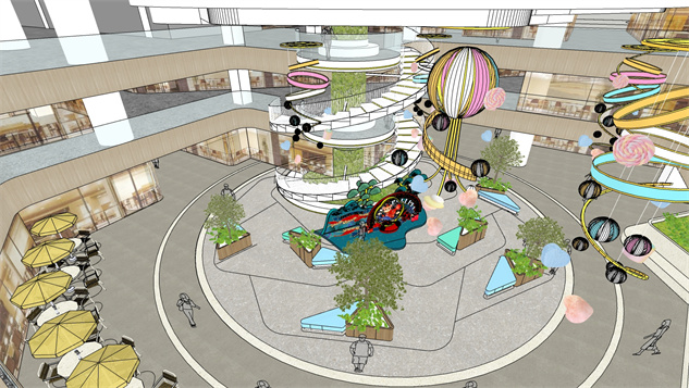 作品介绍:中庭作为商场共享空间的核心,兼具观赏、休闲等多重功能。此中庭面积较大,在提倡低碳环保理念的当下,空间界面规划方面,我选择在中庭一侧布置展陈营造节日气氛,其余部分保留前期中庭展示,以此将中庭空间的空间尺度合理展现出来。