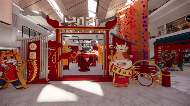 作品介绍:作品利用中庭空间,打造新年韵味的商业特色空间,利用特色步行短街与特色商铺的搭配,让顾客有驻足观赏的理由,从而为商场营造人气火爆的氛围,吸引更多顾客进入。