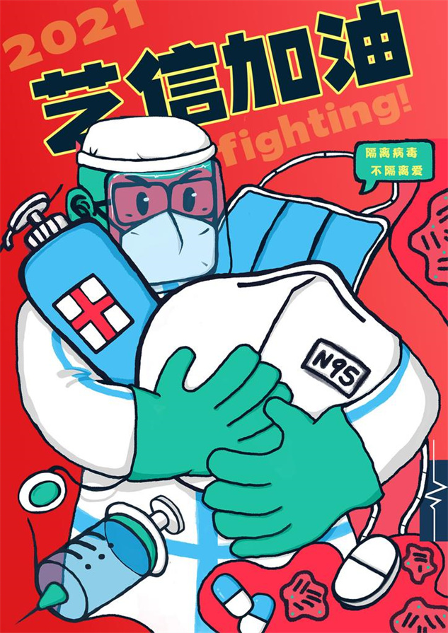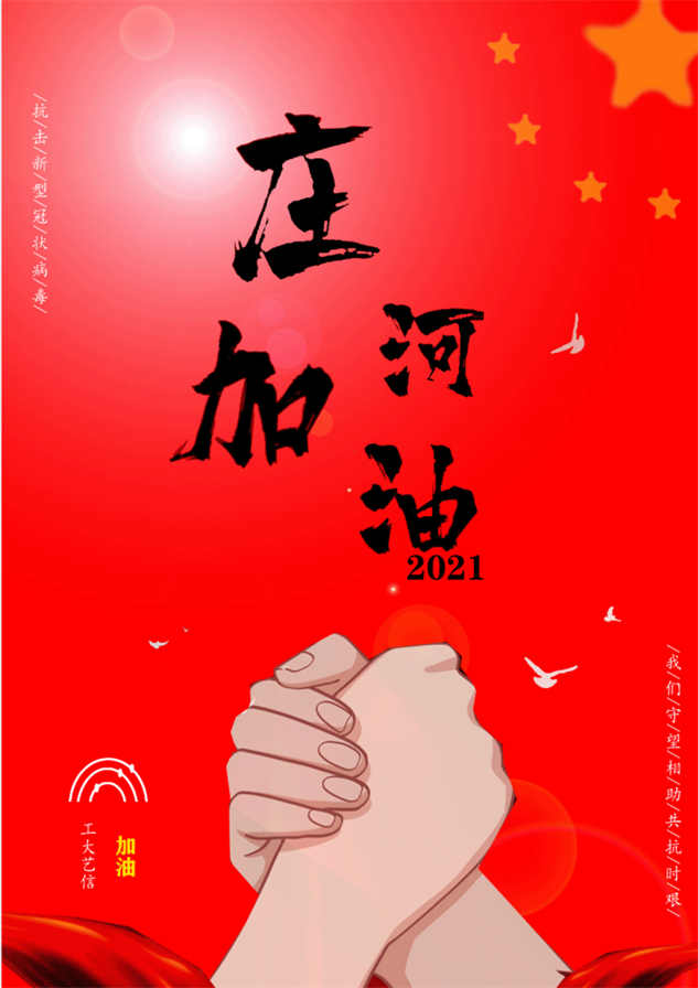 作品介绍:因为疫情大学城实行封闭管理,期间,很多志愿者和医护人员来到这里为我们付出,留下了许多感人故事。为此,我制作这张海报鼓励大家,共同抗击疫情,为大学城加油,为庄河加油!