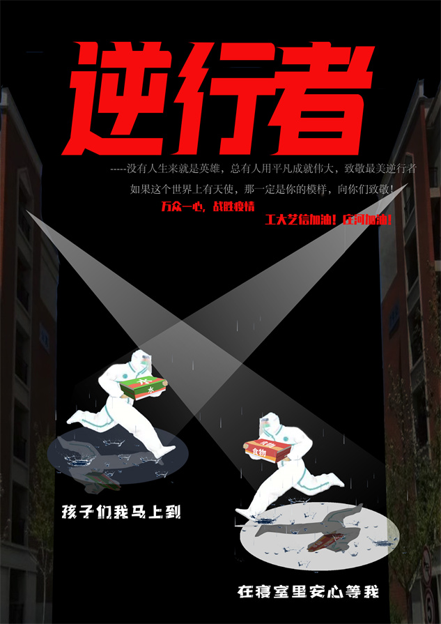 作品介绍:作品灵感来自于志愿者冒雨为我们送物资的真实场景。当天,寒风呼啸、雨雪交加,这样的天气即使手中不拿重物行走在外面也会感觉到吃力,而志愿者们迎风冒雨为我们送来生活物资,站在窗边的我们看到他们在楼下奔跑的身影,瞬间被温暖到。于是,便有了今天这幅海报。海报整体采用舞台灯光构图手法,暗夜背景衬托逆行者身上的人性光辉,在风雪里奔跑的逆行者们传递的不仅有物资还有爱心与力量。我希望通过这张海报,能让更多人记住那难忘的一夜,在未来的日子里把爱心与力量传递给更多需要帮助的人。