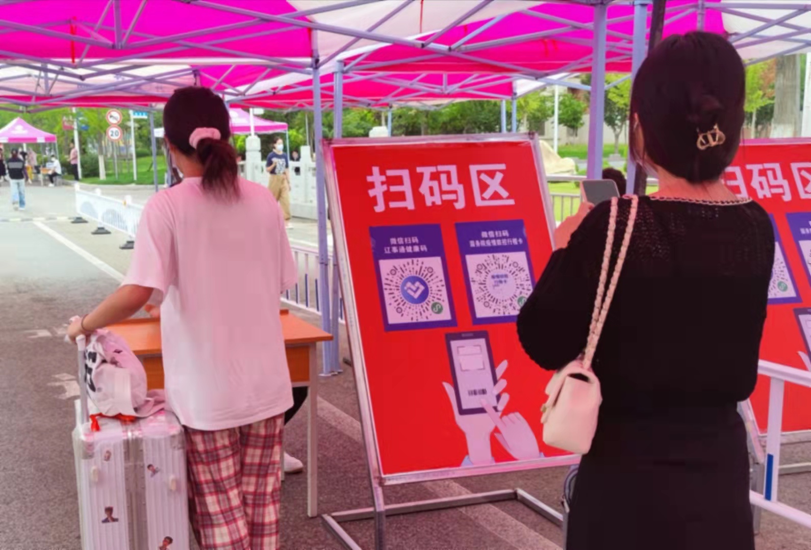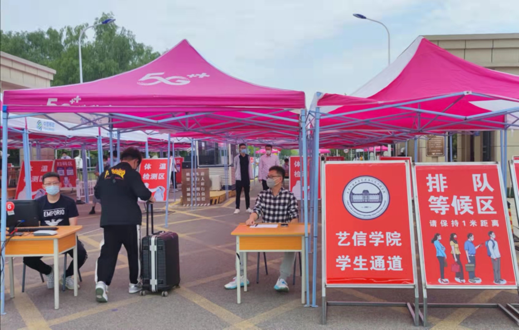 为了最大程度方便同学回寝室,学校特在离寝室最近的南次门迎接同学返校。到达南次门后,同学们便可在等候区排队,逐一经过体温测量,返校签到,核酸检测证明、健康码、行程码三码查验,核酸检测等环节。学生处、保卫处、医护人员、后勤工作人员引导学生安全有序进校,并在校门口设立临时隔离区应对异常情况。