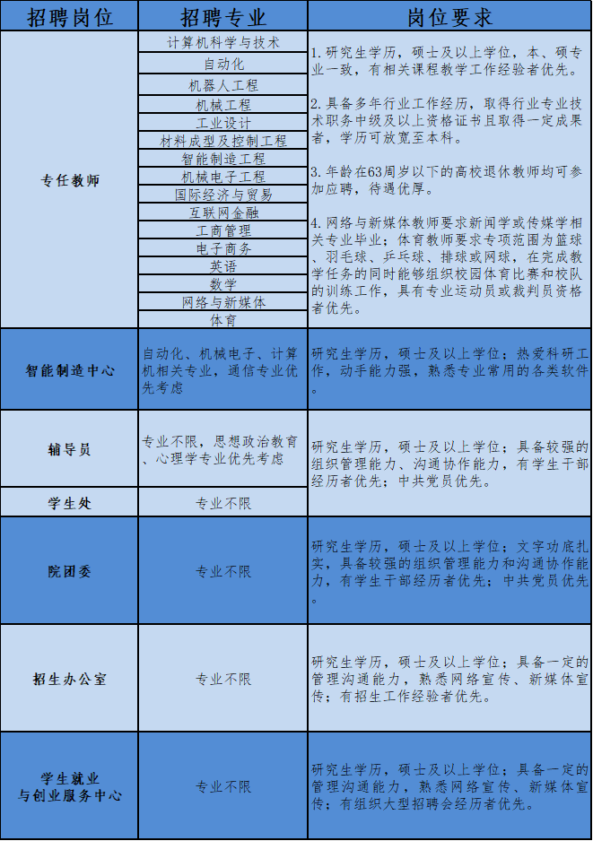 本次招聘学院仅通过邮箱收取电子简历,通知形式为学院办公电话,不通过其他途径接收报名信息,也不委托其他任何机构组织面试、考核等,报名人员请勿相信其他招聘渠道。
